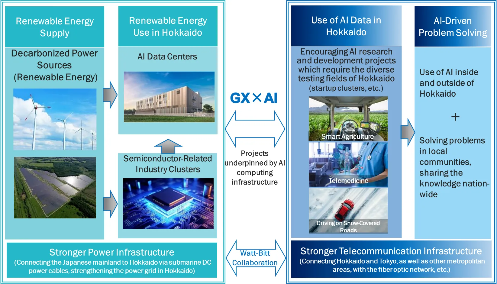 Based on these power transmission and communications infrastructures, Hokkaido is promoting initiatives such as “watt–bit integration” and GX × AI, with the aim of expanding the use of AI and addressing regional and societal challenges through AI. Ultimately, Hokkaido seeks to establish itself as a data center hub for Asia.